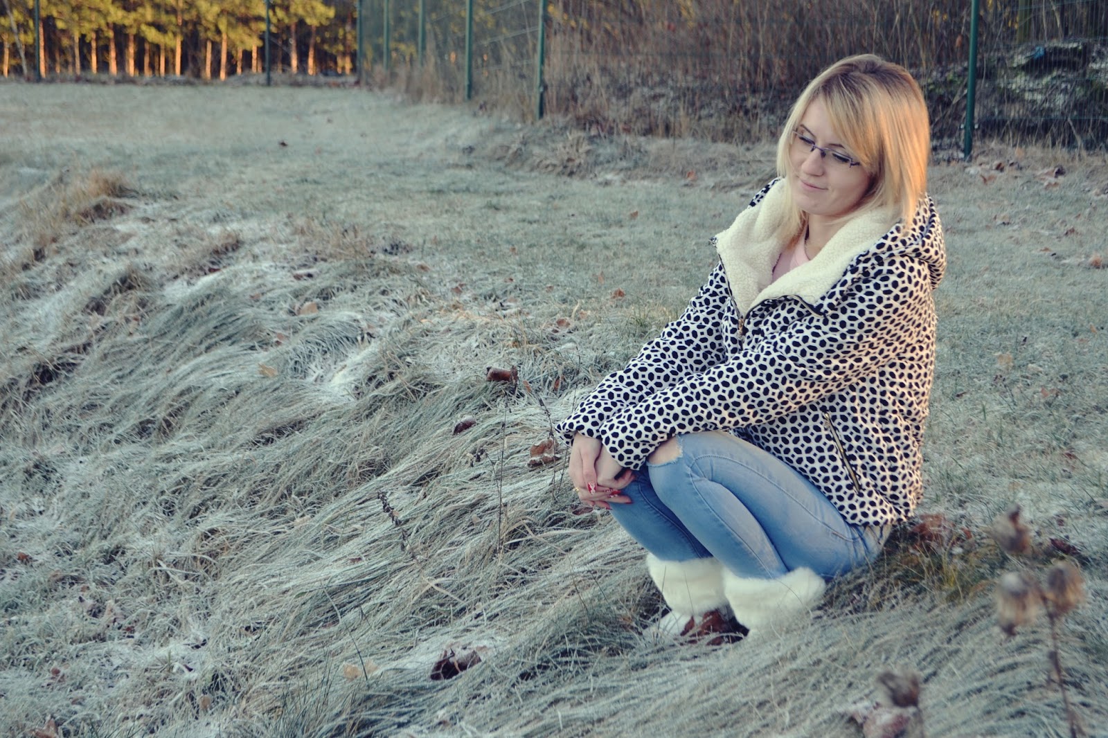Przechodząc do stylizacji to jest to połączenie "na luzie". Moje ulubione jeansy z dziurami musiały się pojawić. Uwielbiam je. Kurtka piękna, jak mi przyszła myślałam, że jest cała ocieplana. No właśnie nie, ale wiecie co? Wczoraj przy -15 było mi w niej ciepło. Pod spód założyłam różową bluzę. Mukluki dodają uroku stylizacji, są meega mega ciepłe. Idealne na te mroźne dni.